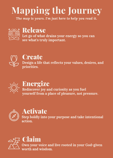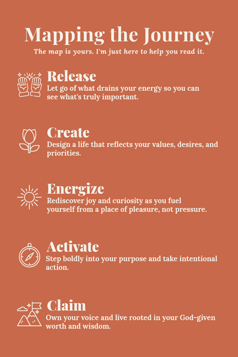 1:1 support designed just for you. Coaching is tailored to your goals, challenges, and season of life whether you're navigating stress, pursuing growth, or seeking clarity in your faith and purpose. Expect deep conversation, practical tools, and unwavering encouragement.