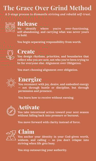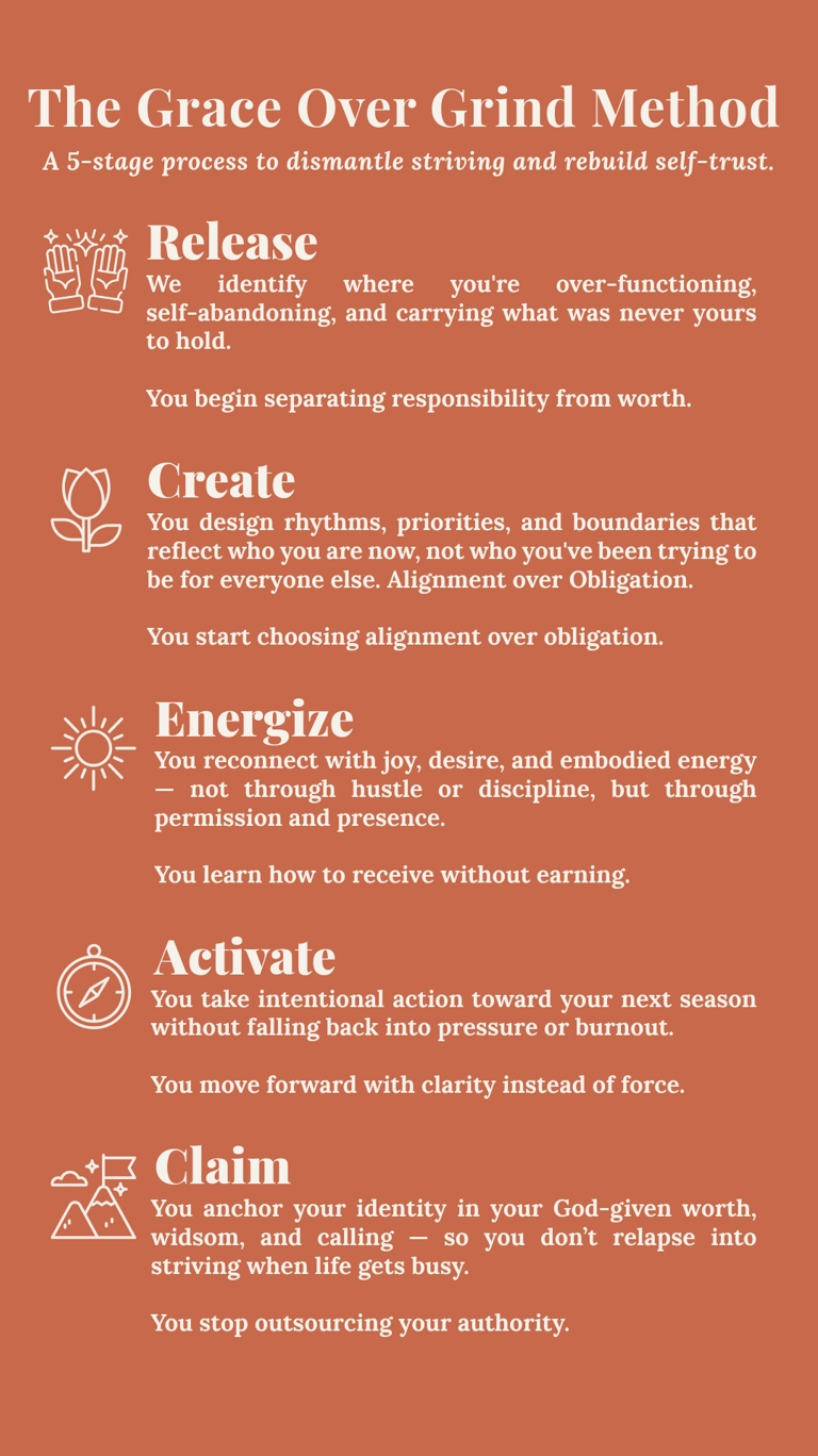 Grace Over Grind is a 10-week, high-touch coaching journey for women in their 20s and 30s who are ready to stop striving and start living differently.